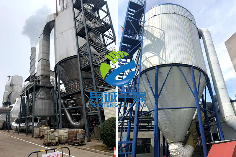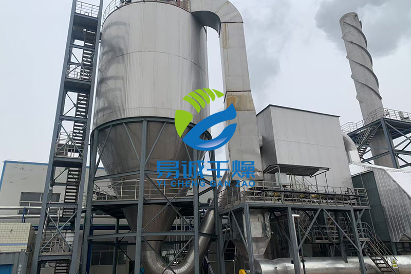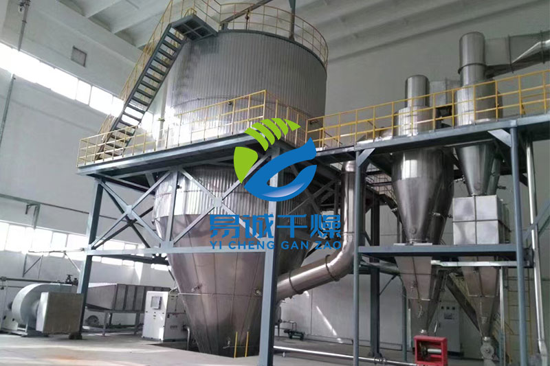 空气经过过滤和加热,进入干燥器顶部空气分配器,热空气呈螺旋状均匀地进入干燥室。料液经塔体顶部的高速离心雾化器,(旋转)喷雾成极细微的雾状液珠,与热空气并流接触,在极短的时间内可干燥为成品。成品连续地由干燥塔底部和旋风分离器中输出,废气由风机排空。
